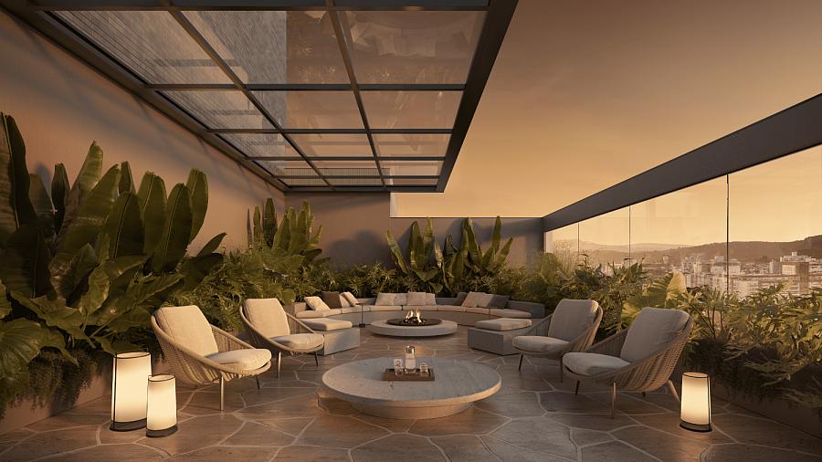 O condomínio conta com uma área de lazer e convivência mobiliada, decorada e climatizada.