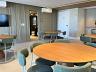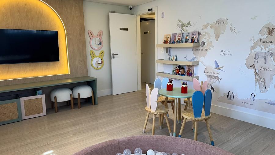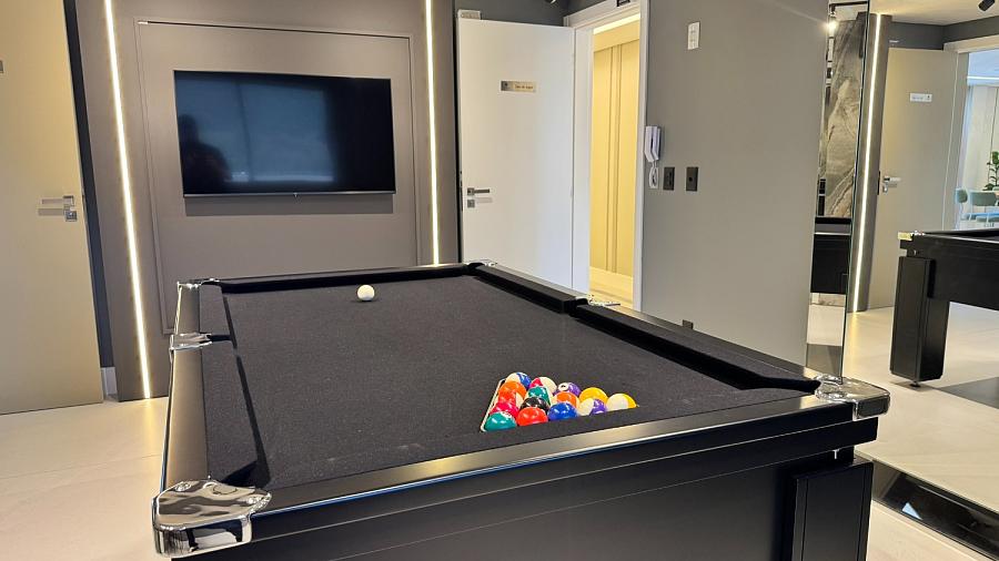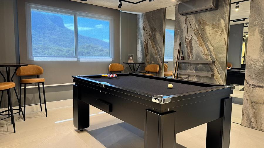 O condomínio conta com uma área de lazer e convivência mobiliada, decorada, equipada e climatizada.