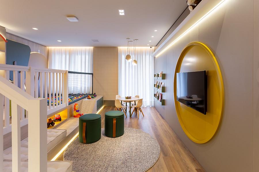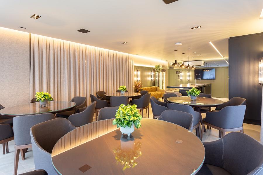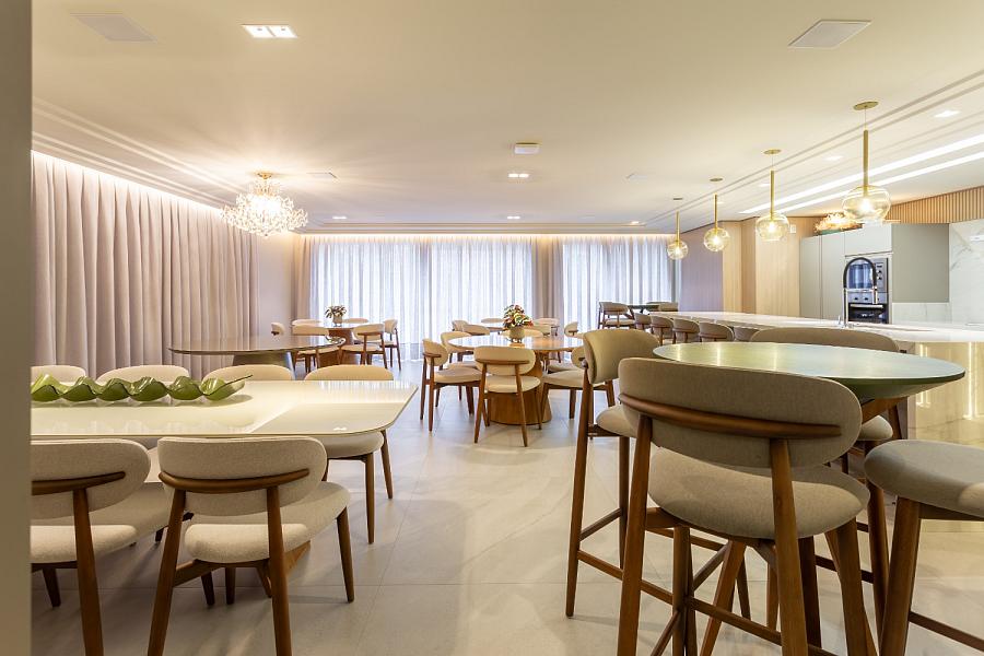 O condomínio conta com uma área de lazer e convivência mobiliada, decorada e climatizada.