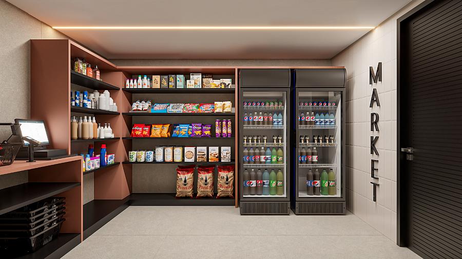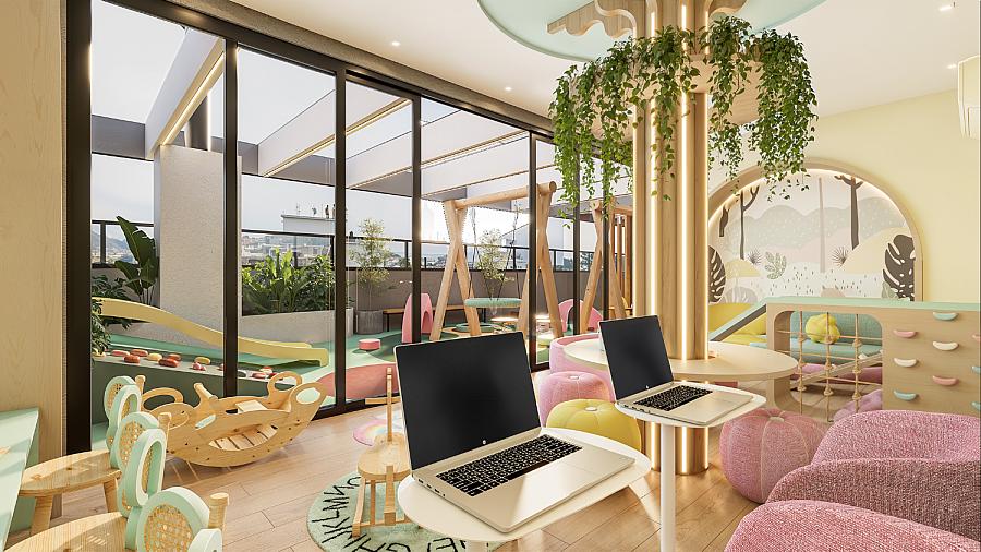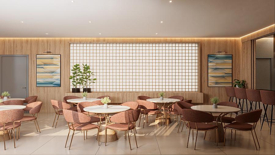 O condomínio conta com uma área de lazer e convivência mobiliada, decorada e climatizada.