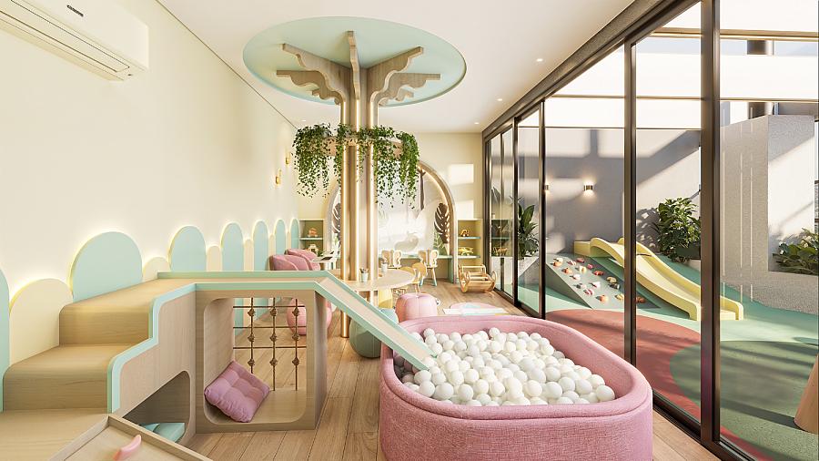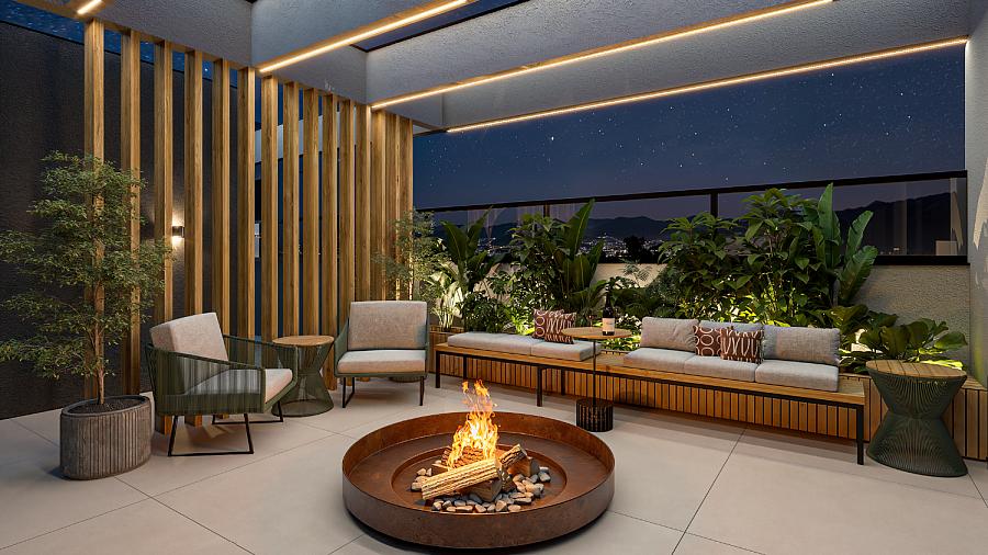 O condomínio conta com uma área de lazer e convivência mobiliada, decorada e climatizada.