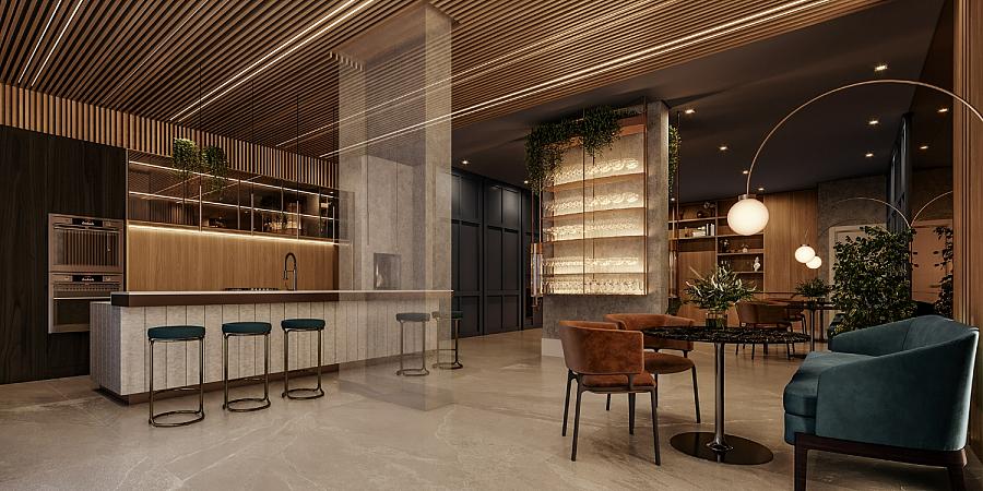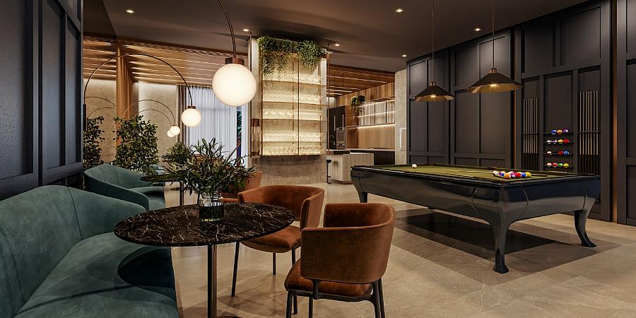 O condomínio conta com uma área de lazer e convivência mobiliada, decorada e climatizada.