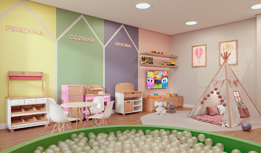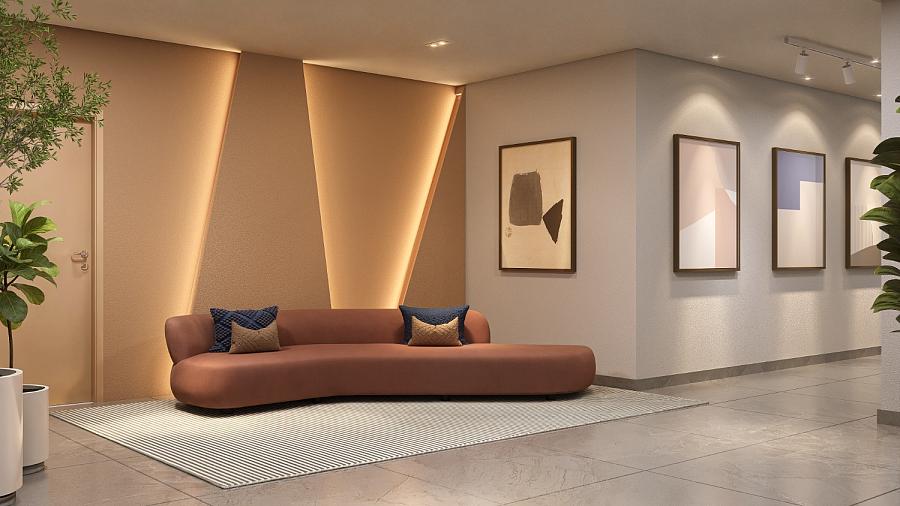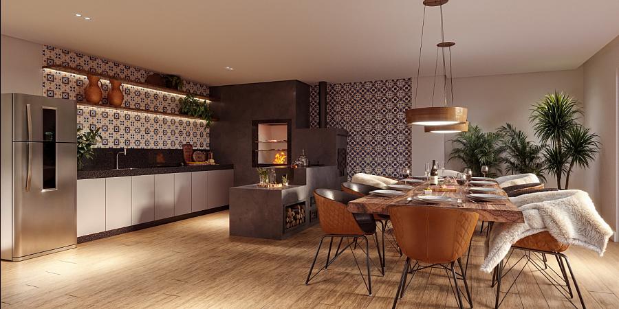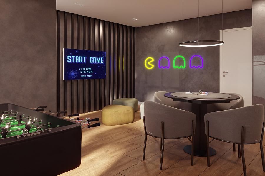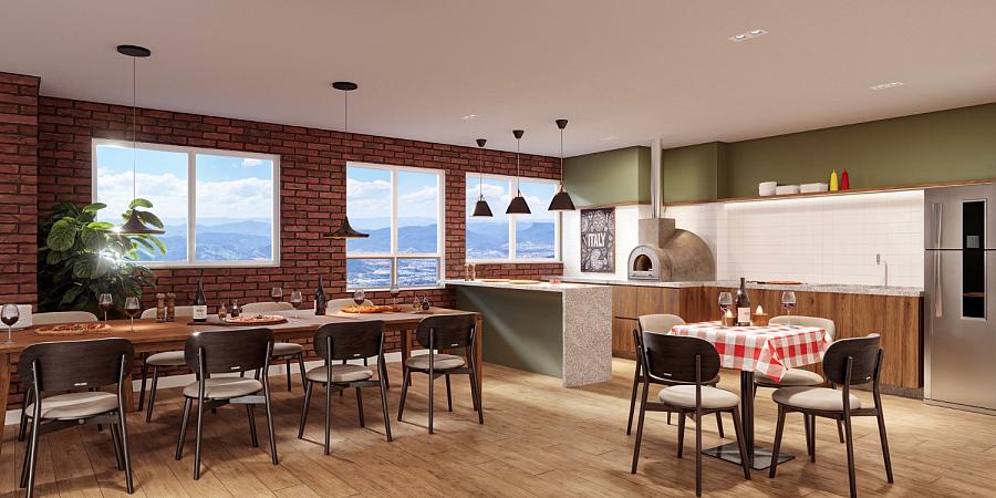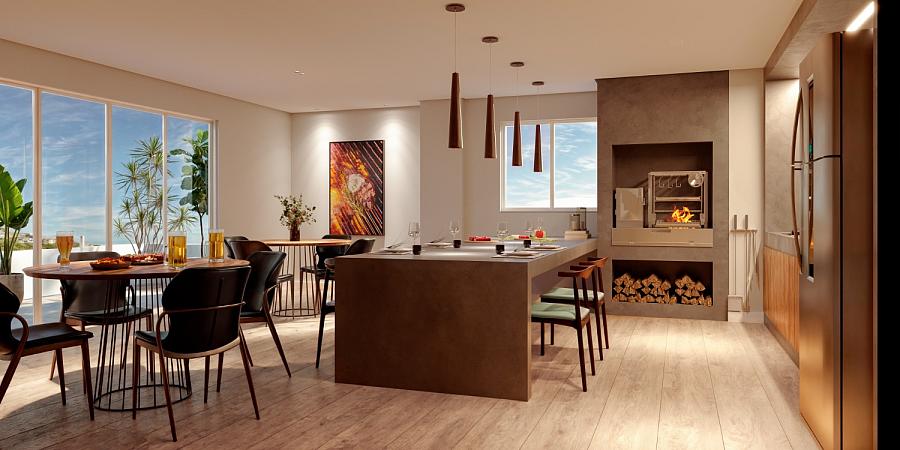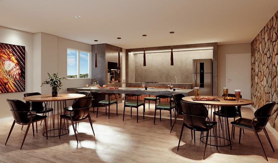 O condomínio conta com uma área de lazer e convivência mobiliada, decorada e climatizada.