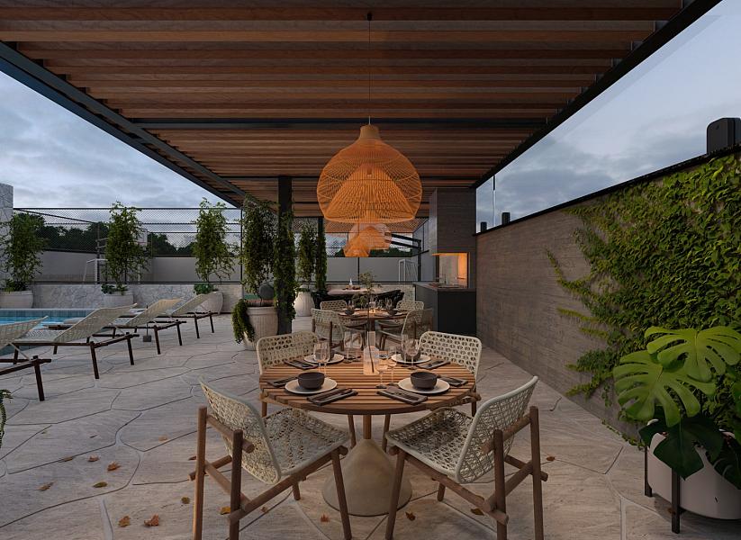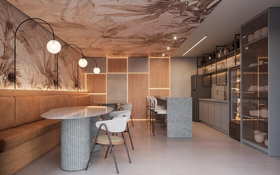 O condomínio conta com uma área de lazer e convivência mobiliada, decorada e climatizada.