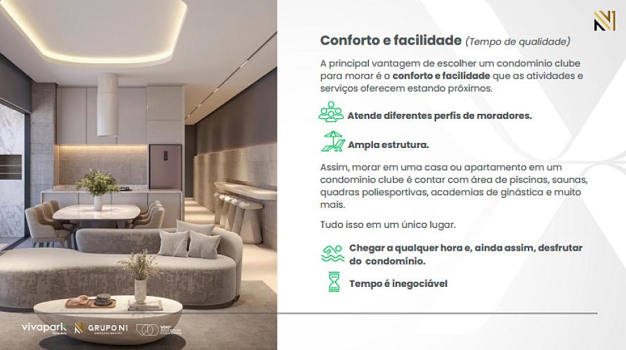 O condomínio conta com uma área de lazer e convivência mobiliada, decorada e climatizada com 5.800m², um verdadeiro HOME CLUB que oferece aos seus moradores a oportunidade de socializar e interagir com segurança e conforto.