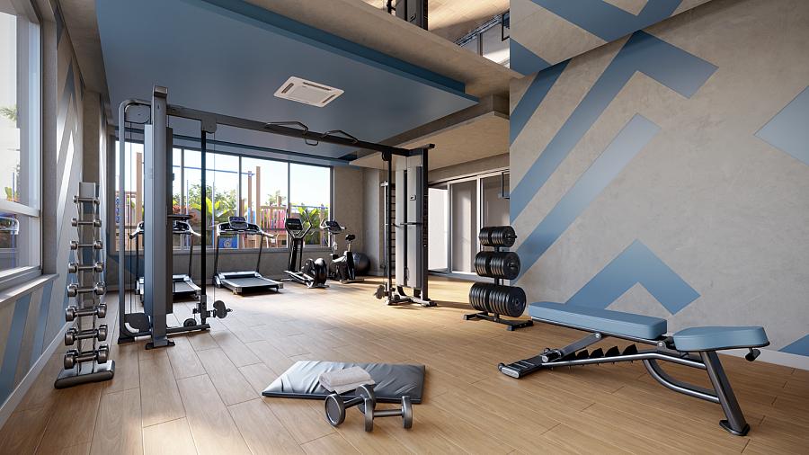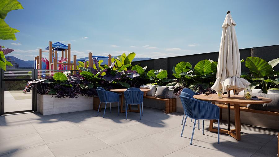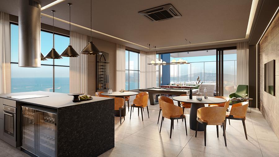 O condomínio conta com uma área de lazer e convivência mobiliada, decorada e climatizada.