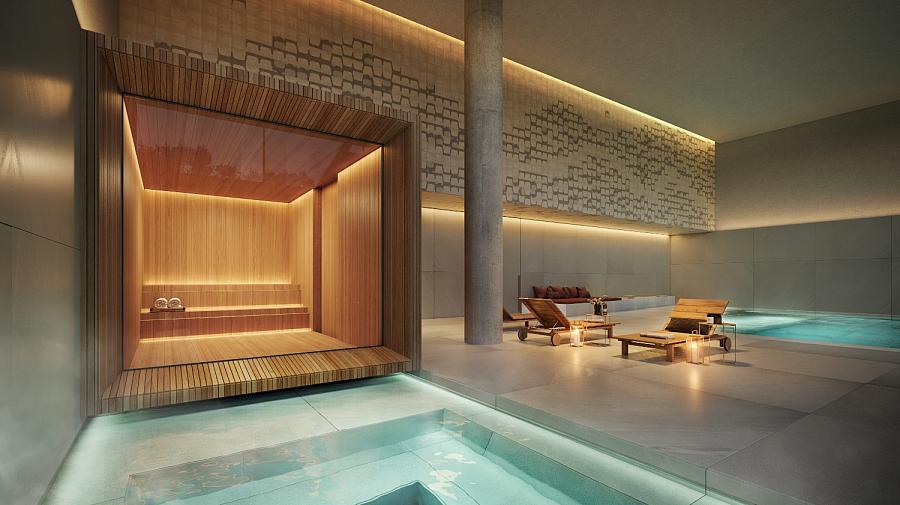 - Área de spa com sauna, sala de massagem e piscina aquecida.