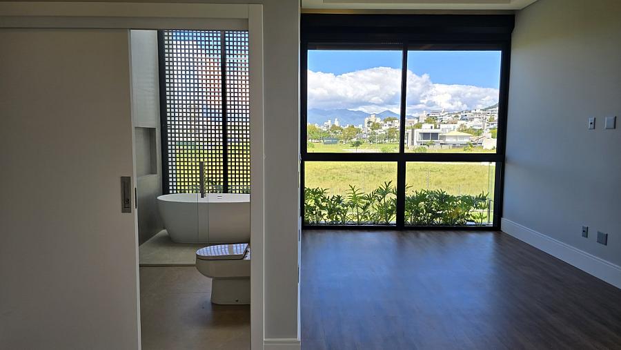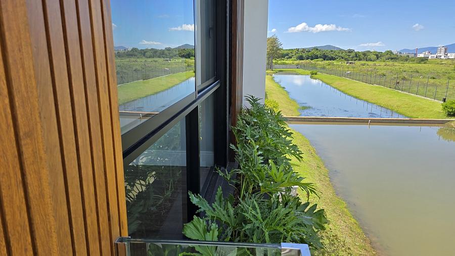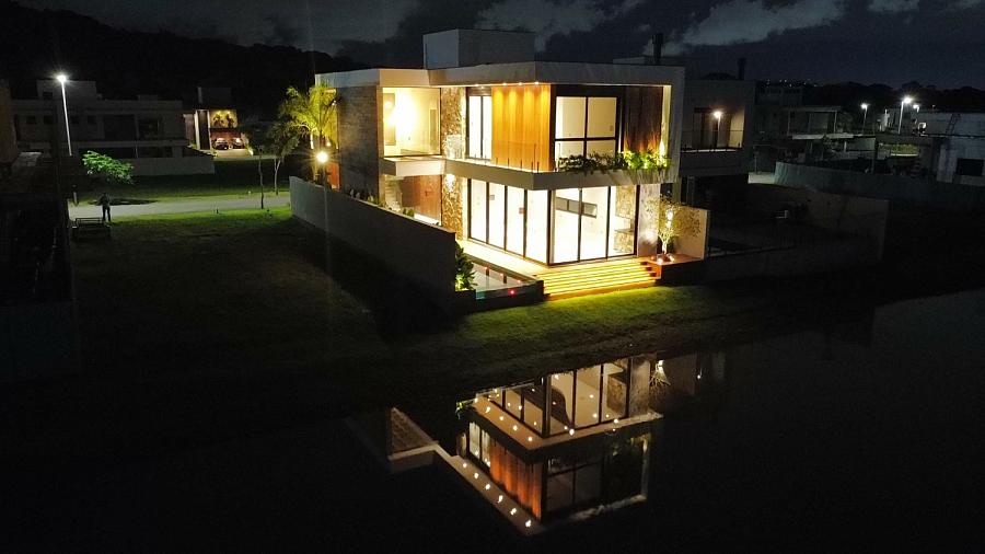 Com 3 amplas suítes, sendo uma master com hidromassagem, espaço gourmet integrado a cozinha com vista permanente para o lago e um living com pé direto de 7,3m trazendo amplitude e muita iluminação natural.