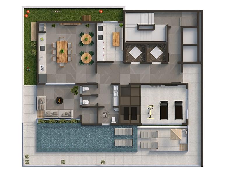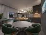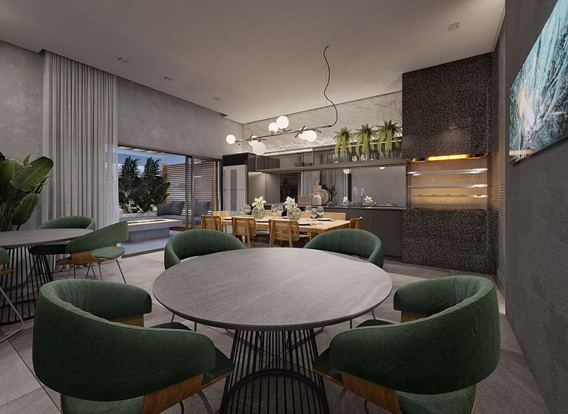 O condomínio conta com uma área de lazer e convivência mobiliada, decorada e climatizada.